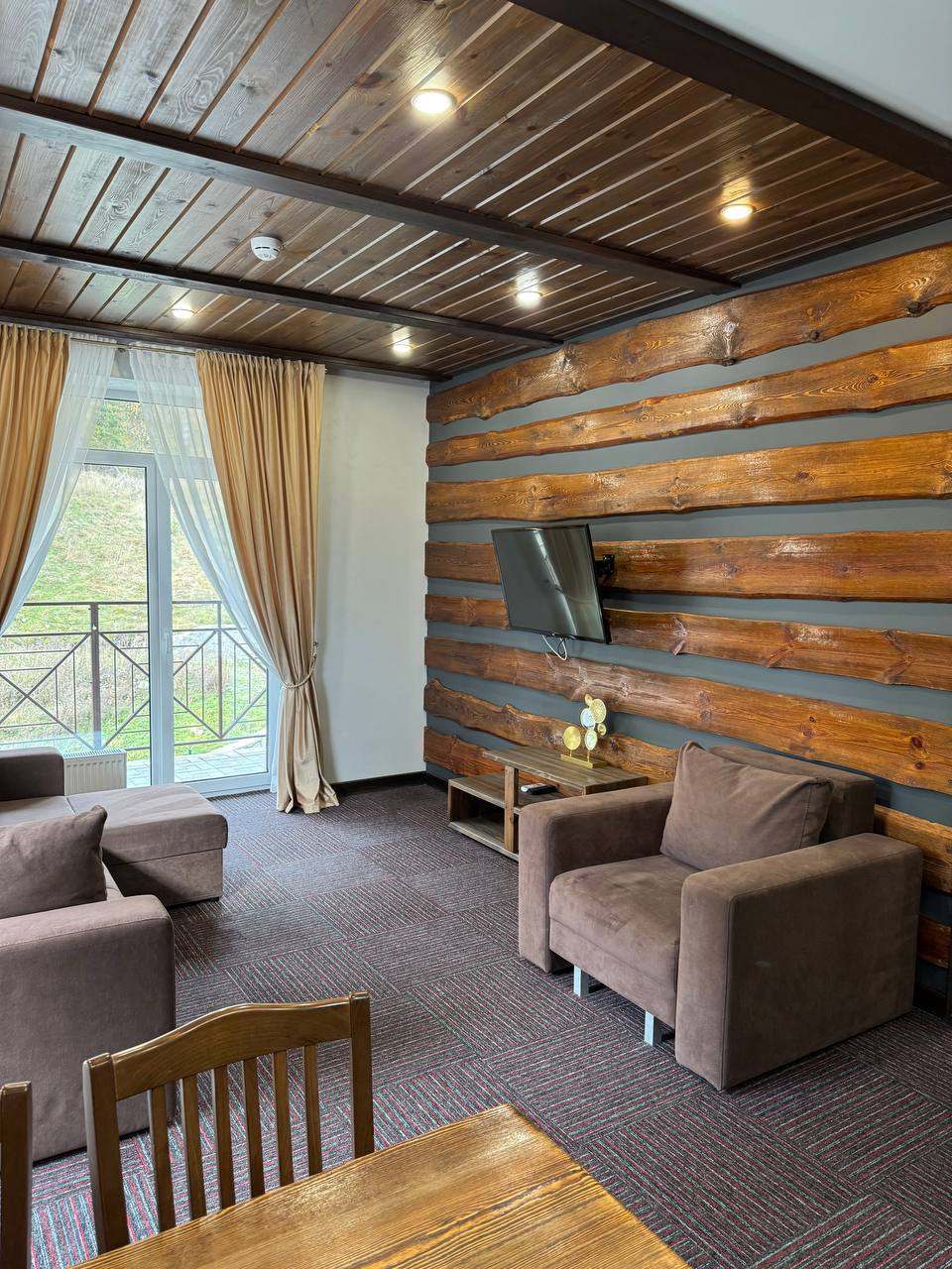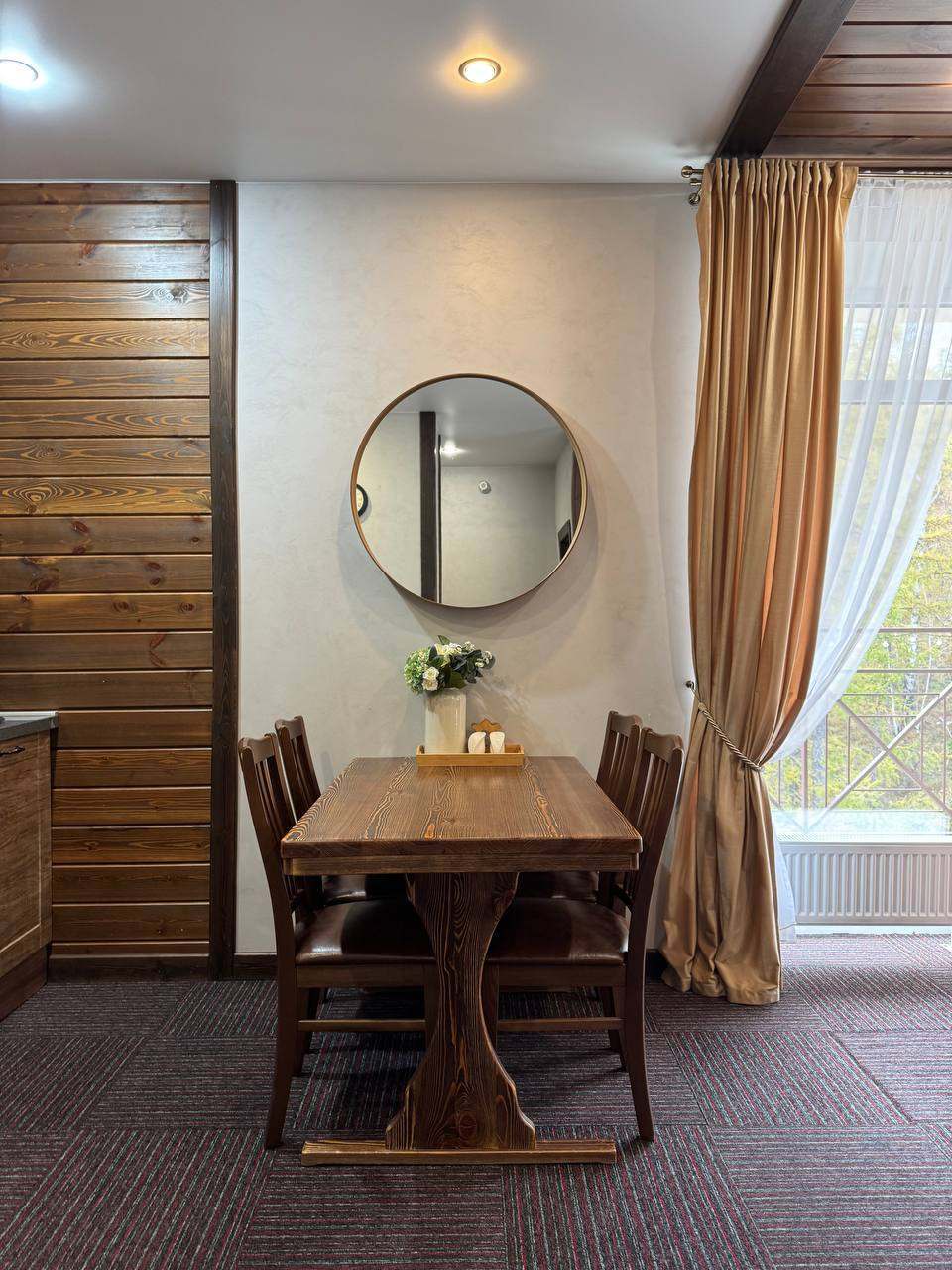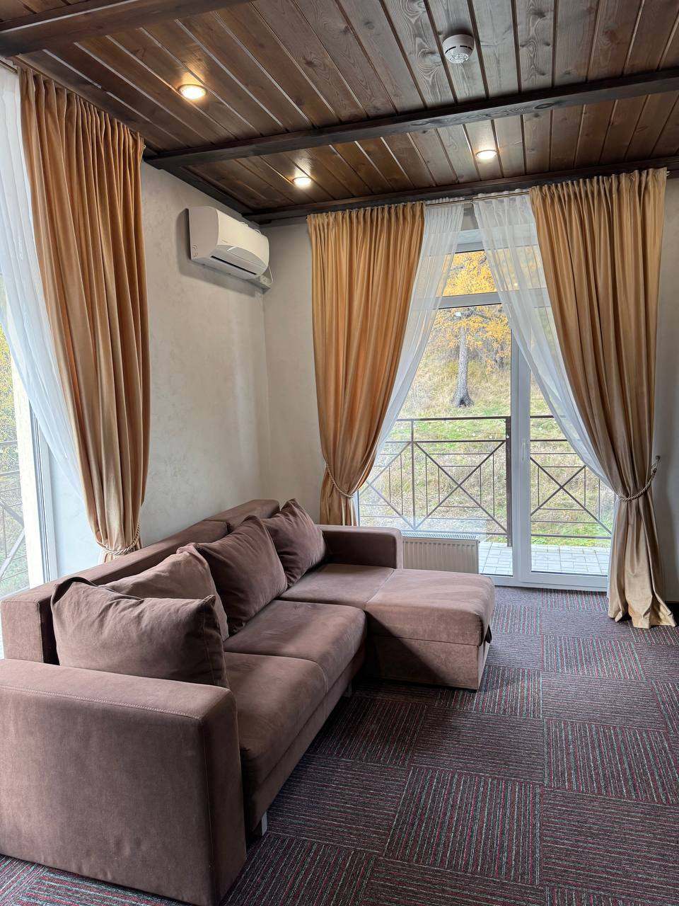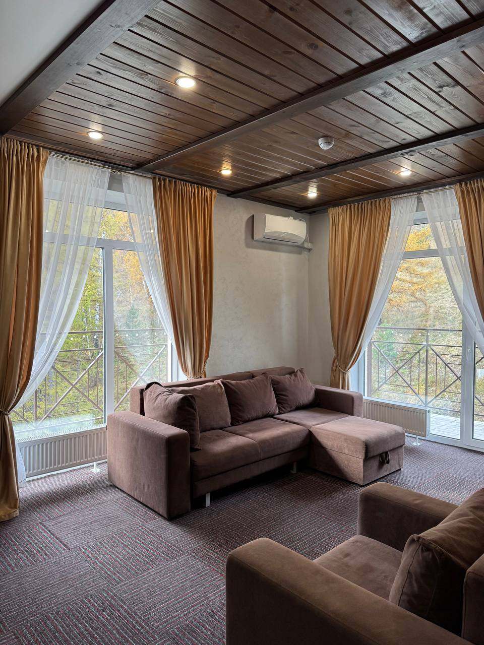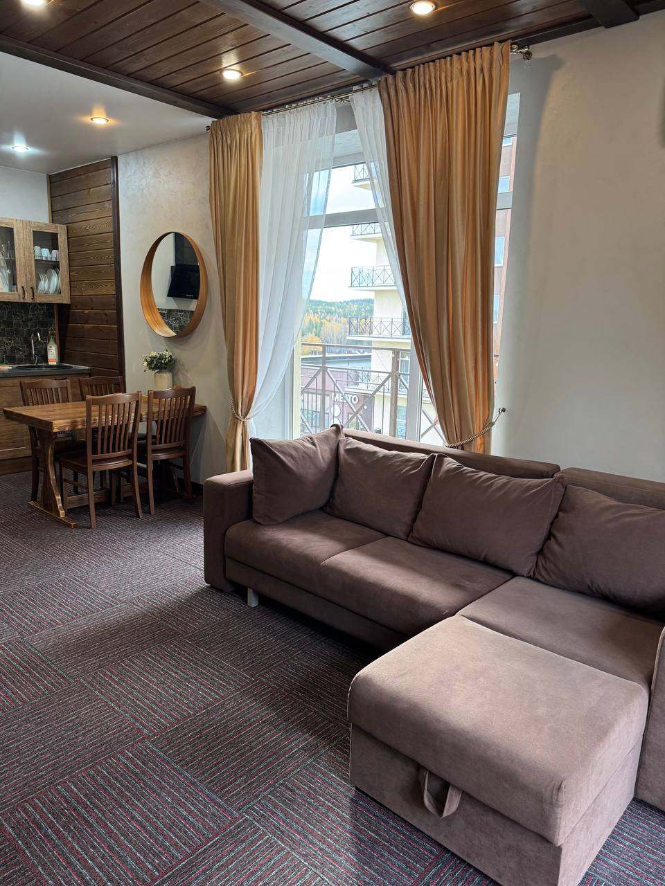 Комфортный апартамент с отдельной спальней и гостиной в отеле Sport Residence на 4 этаже для 5 гостей, с прекрасным видом на горы, лес и озеро. В спальне двуспальная кровать, телевизор и кондиционер, в гостиной раскладной диван на двоих гостей, кресло-кровать, телевизор и кондиционер. В номере есть кухня, полностью оборудованная всей посудой и техникой для длительного, комфортного проживания. Сан. узел с душевой кабиной, стиральной машинкой и феном.