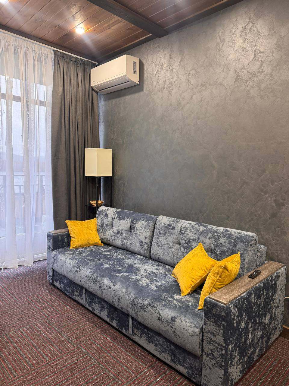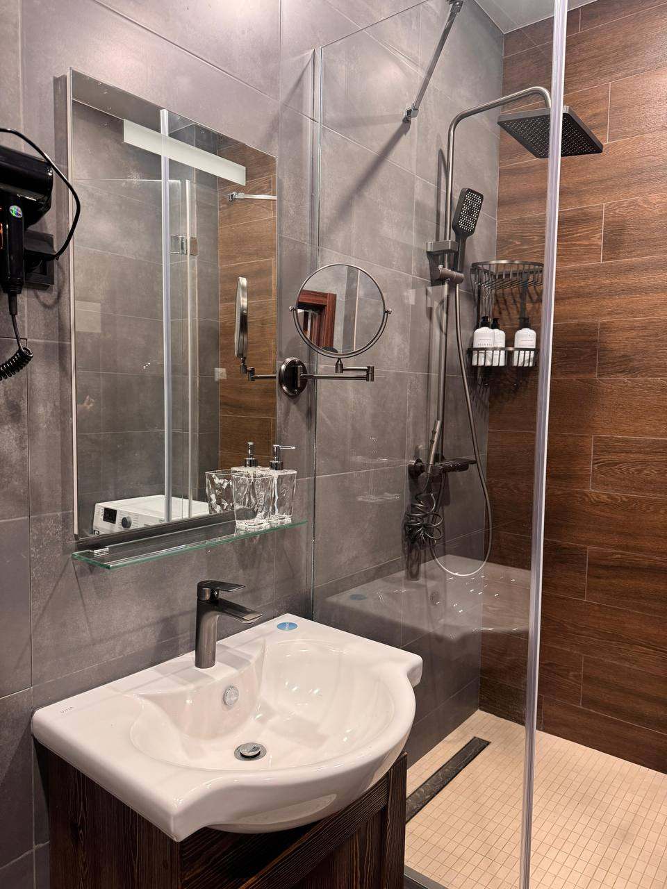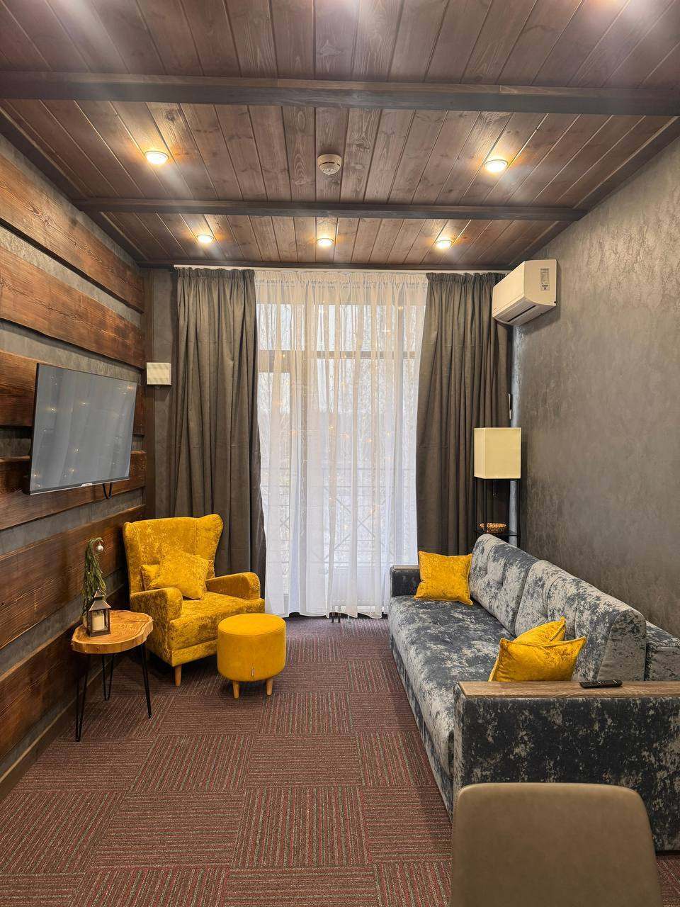 Апартамент для семьи в 5 новом шале, с отдельной спальней, гостиной и с красивым видом на прудик и лес. Площадь номера 50 квадратов, где с комфортом разместятся до 4 гостей. В спальне двуспальная кровать, смарт-тумба прикроватная с подсветкой и беспроводной зарядкой, колонками блютуз, телевизор, кондиционер, шкаф. В гостиной раскладной диван на двоих гостей, телевизор, кондиционер. На кухне есть вся необходимая посуда и техника для длительного проживания, а также кухонная мойка с измельчителем отходов, посудомоечная машинка. В сан. узле душевая кабина с современной душевой системой, автоматический умный унитаз, фен, стиральная машина.