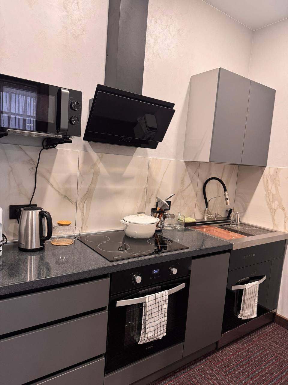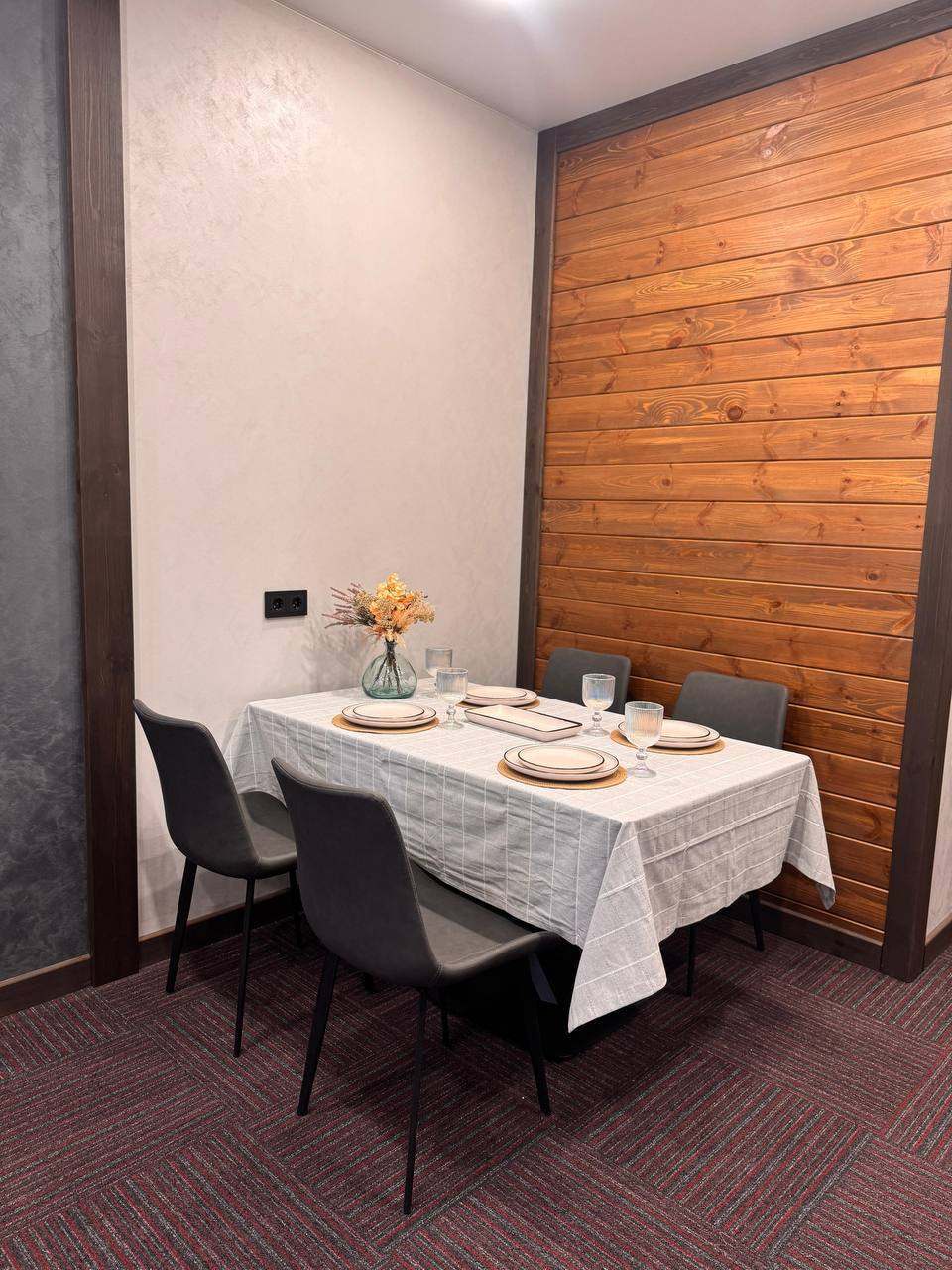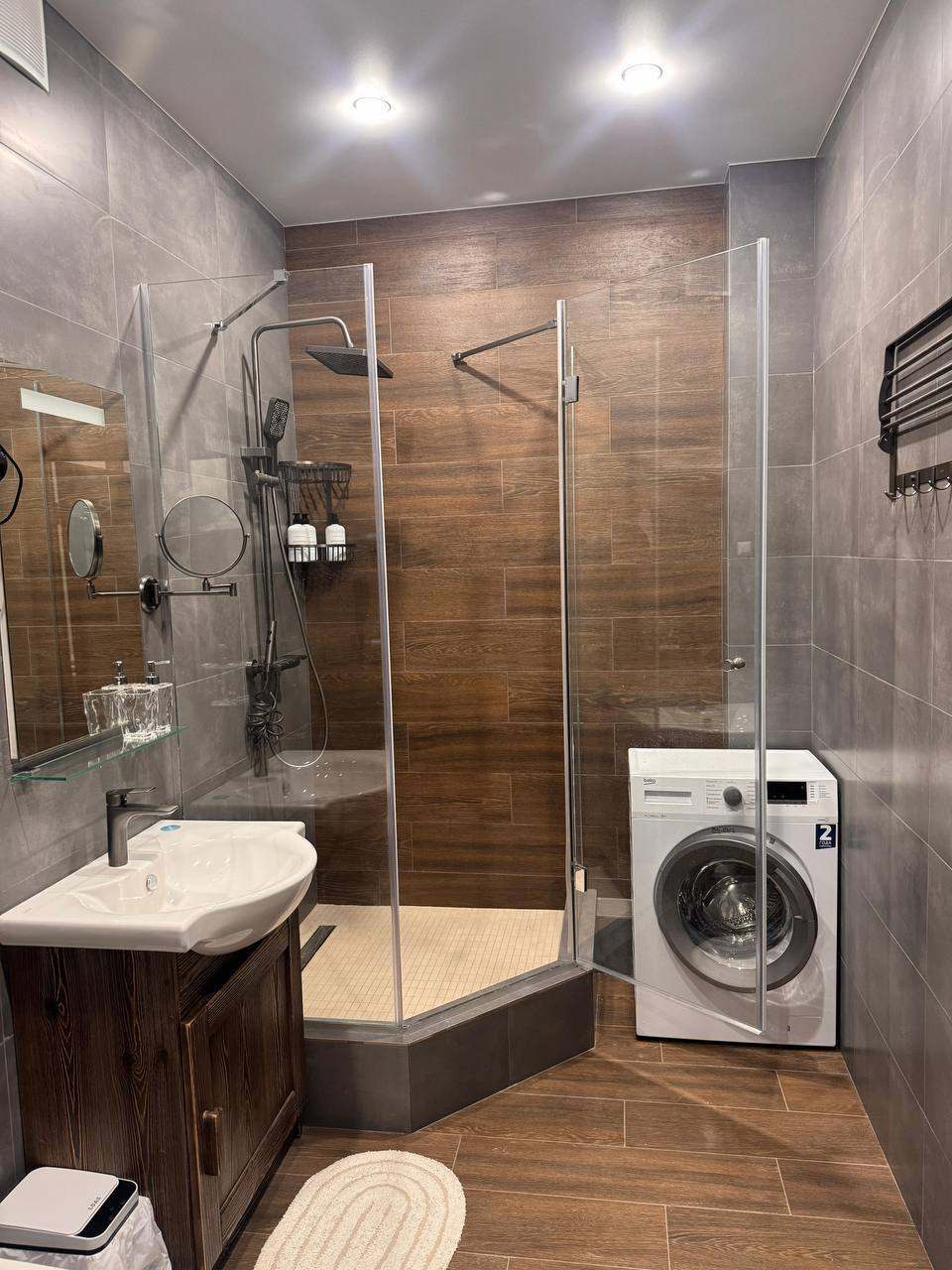 Апартамент для семьи в 5 новом шале, с отдельной спальней, гостиной и с красивым видом на прудик и лес. Площадь номера 50 квадратов, где с комфортом разместятся до 4 гостей. В спальне двуспальная кровать, смарт-тумба прикроватная с подсветкой и беспроводной зарядкой, колонками блютуз, телевизор, кондиционер, шкаф. В гостиной раскладной диван на двоих гостей, телевизор, кондиционер. На кухне есть вся необходимая посуда и техника для длительного проживания, а также кухонная мойка с измельчителем отходов, посудомоечная машинка. В сан. узле душевая кабина с современной душевой системой, автоматический умный унитаз, фен, стиральная машина.